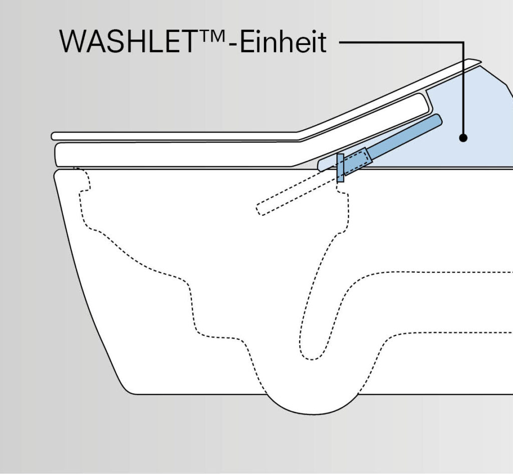 Wenn die Düse oberhalb der WC-Keramik positioniert ist, erreichen wir eine strikte Trennung von Wasch- und Fäkalbereich. Die Düse ist vor dem verschmutzten Spülwasser und auch vor eventueller Verstopfung geschützt. Ein ganz wesentliches Merkmal für die Sauberkeit und Hygiene bei einem Dusch-WC, das leider noch nicht Standard ist.